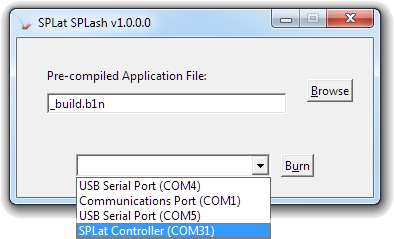 The SPLat SPLash program lets you, or your customers, upload an application program (“SPLatWare”) to a SPLat controller board quickly and easily, without having to use the SPLat/PC programming tool.