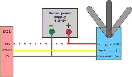 The following diagram shows the connections for an external power supply for large or multiple servos. The dotted red line shows how you would supply power to the EC1 from the same power supply only if you are not powering it from your computer via the USB cable.