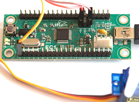 The photo below shows the connections to the EC1. For a single servo the power for the servo (red wire) can be taken out of a +5V power out pin on the EC1. The servo ground (0V, negative) wire (brown on my servos) goes to a 0V pin on the EC1. For this EasyStep the PWM control signal (yellow wire) comes from the Analog Out 0 pin of the EC1. The "analog outputs" of the EC1 are actually pulse width modulated (PWM) digital outputs. Click here for more details on that.