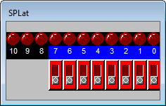 The LEDs at the top represent the digital outputs of the EC1. The tiny switches represent the digital inputs. You can see from this that the EC1 has 11 outputs and 8 inputs. - Push the button switch on the EC1, and notice the response on the I/O window. The push button is on input 0.
