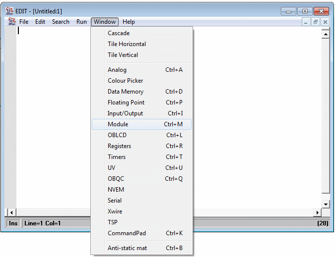 - In the Edit window make the menu selection Window > Module.