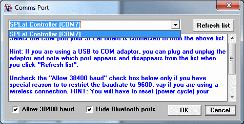 The drop-down list at the top should contain "SPLat Controller", with the same COM number as was reported when the USB driver installed. If it doesn't, unplug and re-plug it in, then click the Refresh List button. - Select your board ("SPLat Controller"). Click OK. This will take you back to the Module window.