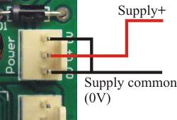 The above illustration shows the power connections to the HD8. We have used a 3-pin connector, to differentiate from 2-pin connectors used elsewhere on the board. There are two pins for 0V (gnd, common). You do not have to wire both to both 0V pins; either one will do. The wire shown in red above should go to the positive terminal of your power supply. The black wire should go to the ground or common terminal of the power supply (often labelled minus on a single voltage supply). See also ‘Some common terminology‘: