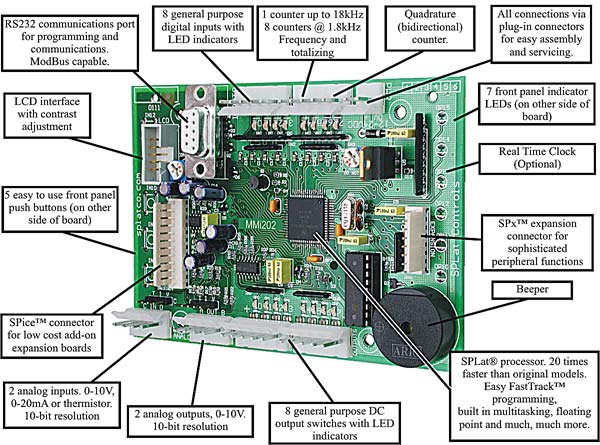 Congratulations on your choice of the SPLat MMi203. The MMi203 is the latest product in a family line that started in 1998 with the MMi88. The MMi88 was the world’s first user-programmable controller with a built in operator interface and user-customizable graphics overlay. Since then the product family has evolved with an LCD and many more onboard features, and is our most successful standard product concept.
