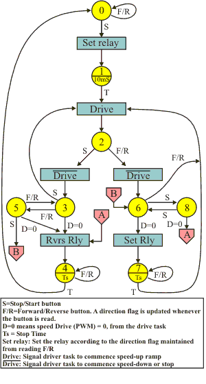 Some of the finer detail is left out, for clarity. For example, the diagram will only make sense if you understand that whenever the Forward/Reverse button is read, an internal direction flag (semaphore) is updated. Using a simple flag to track the user’s desired direction significantly reduces the number of states required. The event “D=0” involve a subroutine call to the driver task to find out of the motor PWM is (yet) zero.