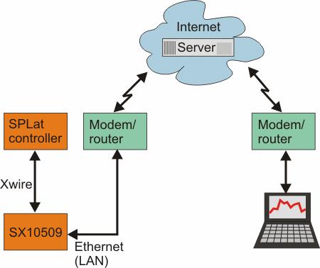 The SX10509 connects to a SPLat controller via Xwire on one side and to the Internet, via Ethernet (“blue cable”), on the other side.