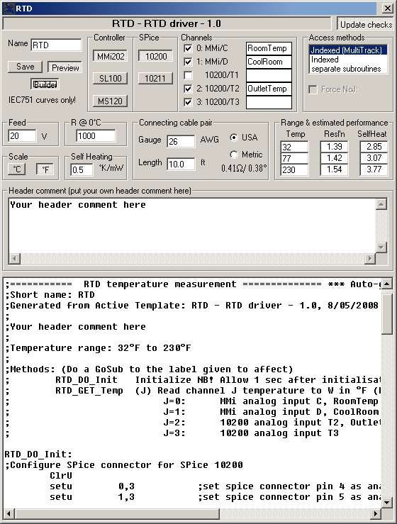The RTD Active Template lets you use Platinum Resistance Detector (RTD) temperature sensors on the standard thermistor analog inputs on MMi202 or SL100 controllers and optional SPice 10200 and SPice10211 add-on boards. It also covers the MS120 with the same SPice boards (the MS120 must have a SPice board for analog input). We advise against trying this with earlier controller models, as they did not have sufficient analog resolution for this to work.