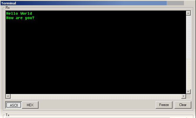 When started, this will pause for 10 seconds (a forced delay before the user protocol kicks in), then send a message out of the serial port. If you have switched to the terminal before then, you should see the result in the Rx window. Click on the ASCII button so you can read it.: