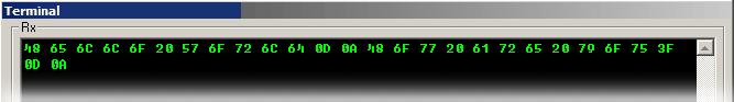 You will notice that the two iiPrintText instructions both have '0D,'0A at the end. These are carriage return (CR) and line feed (LF). They force the terminal to a new line, but are otherwise invisible. Now click the HEX button. The display will switch to showing raw character codes, in hexadecimal: