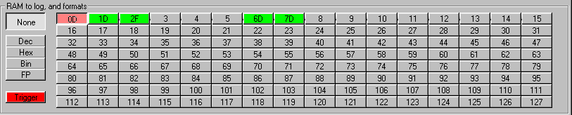 The pane contains a separate selector button for each RAM location. To set up a RAM location for monitoring you select it, then on the left you chose how you want it logged. The choices are: