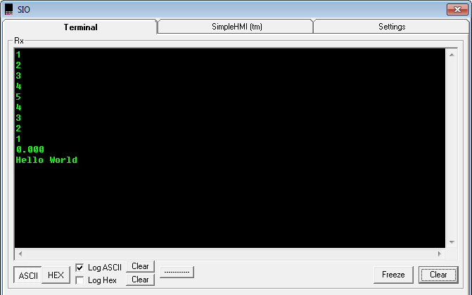The following program will send out ASCII numeric and text strings terminated in carriage return/line feed. You can view the result using the terminal function built into SPLat/PC. Once the program is running (you should see a flashing LED on the MS120 front panel, click the SIO button on the SPLat/PC Module window. This will open up the terminal window. In the settings tab make sure the Comms parameters are 38400 for Baud and N,8,1 for Character (this is the same as on this page. Once the settings are correct, click the Terminal tab, and make sure the ASCII button is depressed. When you start pressing buttons on the MS120 you should see the data from the MS120 displayed on the black terminal display. If you now select the Hex button, you can see the same data in hex.