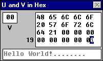 The UV simulation window is illustrated. The small pane in the top lefthand corner represents V. The large pane represents U. U is also shown at the bottom in text format (for those bytes that are readable ASCII codes.). The small number to the left of the large U window is the U index.
