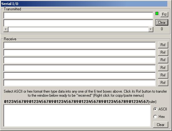 The receive pane contains 6 identical data entry windows, with associated Rx! buttons. This allows you to enter up to 6 different character sequences and simulate their reception. As most of the time you are likely to be writing a program to decode different messages, it is very useful to be able to repeat messages without constantly re-typing them.