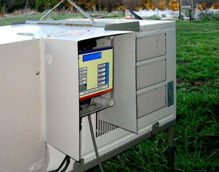 Scientists at the University of Sydney Narrabri Plant Breeding Institute want to simulate the effects of a hotter climate or heat waves on different breeds of wheat in order to find suitable varieties to grow in Australia. The experiments require 20 separate chambers, each with its own reverse cycle air conditioner. $600 commercial A/C’s, while being cheap, clearly do not do what is actually required, so the factory controller was stripped out and replaced with a SPLat MMi202 controller mounted on the side of the A/C, with its user interface easily accessible.